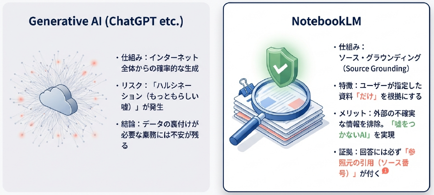NotebookLMがビジネスパーソンに支持される最大の理由は、「ハルシネーション(もっともらしい嘘)」を極限まで防げる点です。